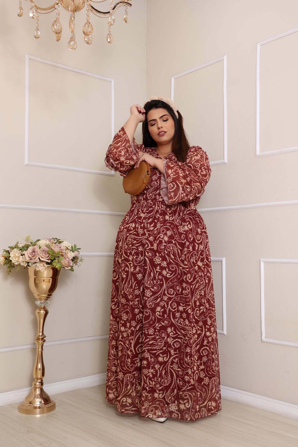 O vestido tem mangas longas com babado e elástico, possui um decote em "V" que realça o colo de maneira discreta, vestido estampado, o tecido parece leve e fluido, Vestido confeccionado em malha tule estampado.